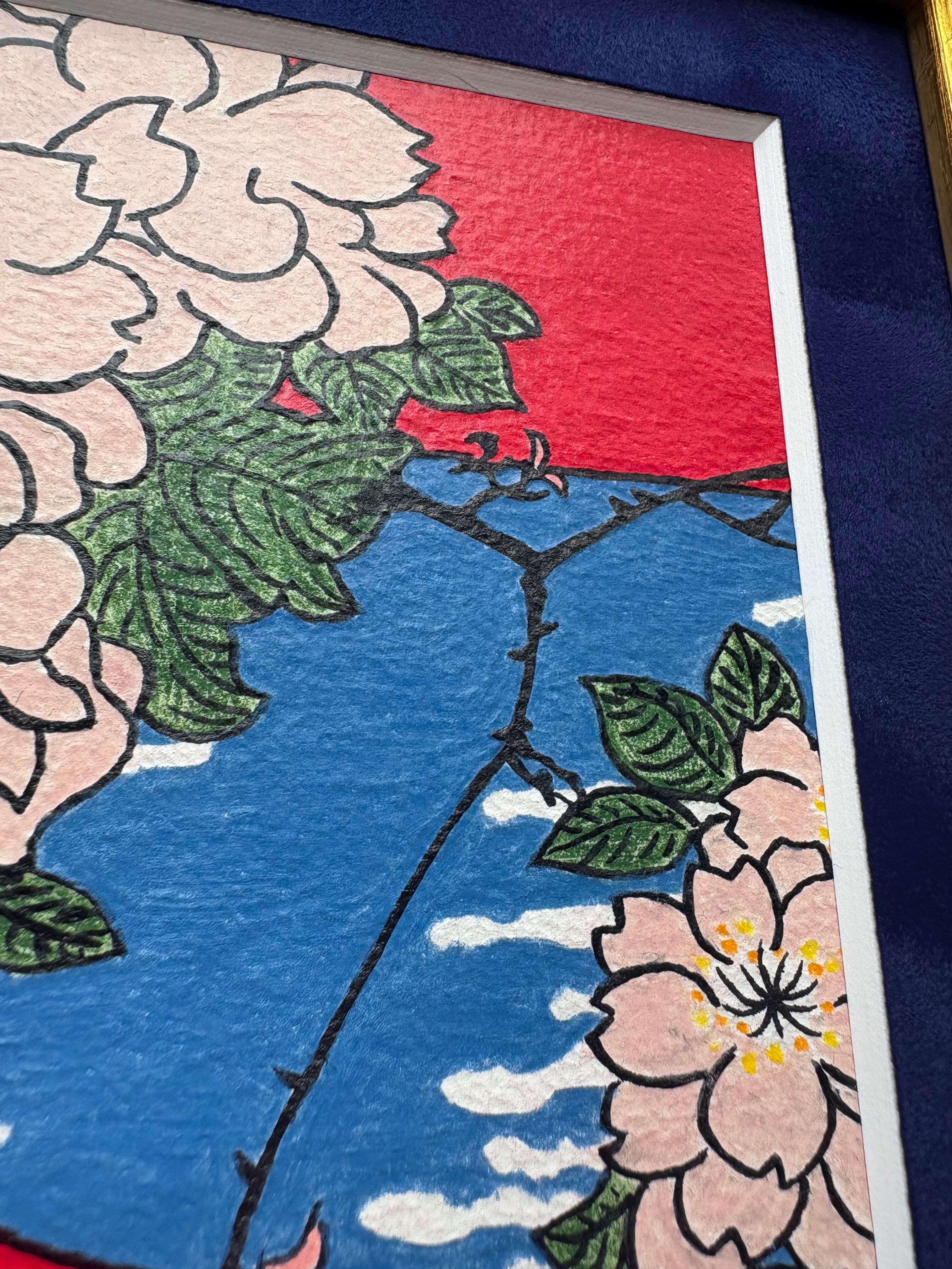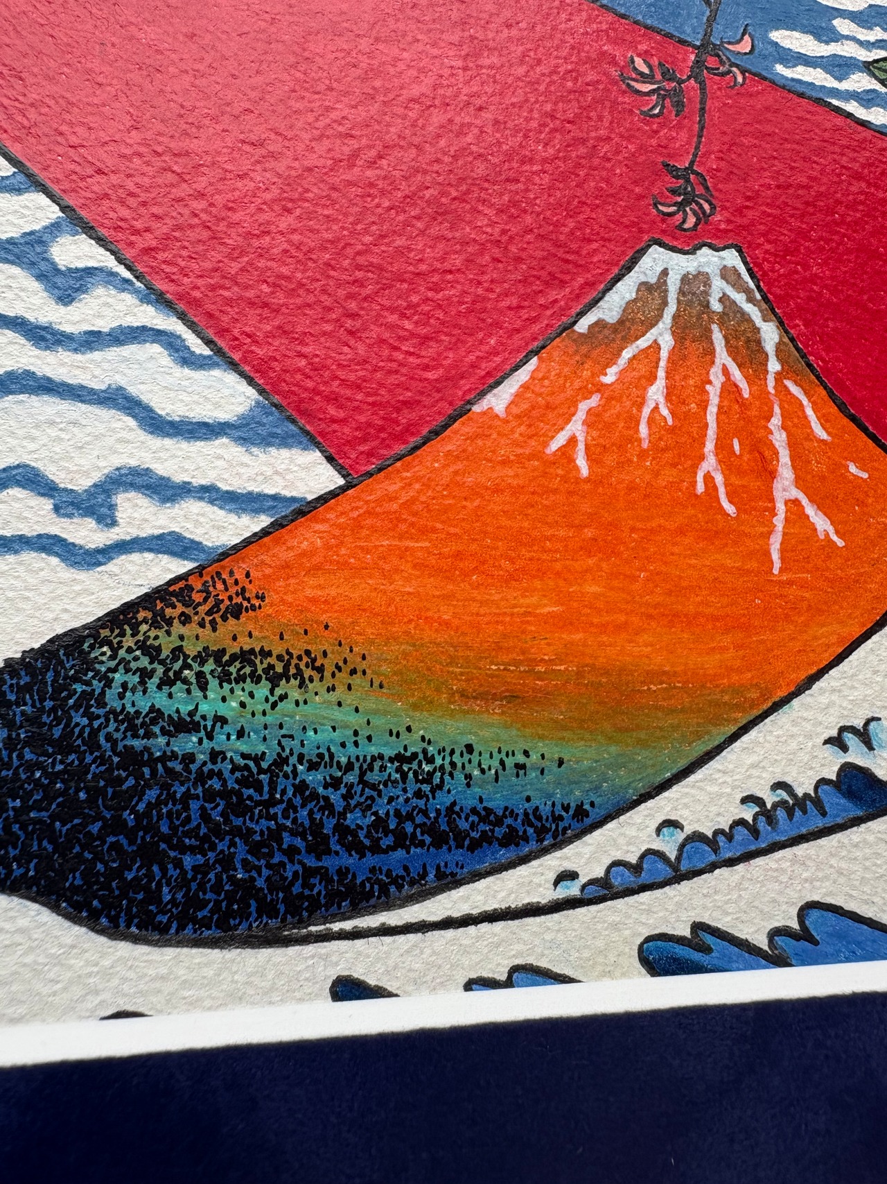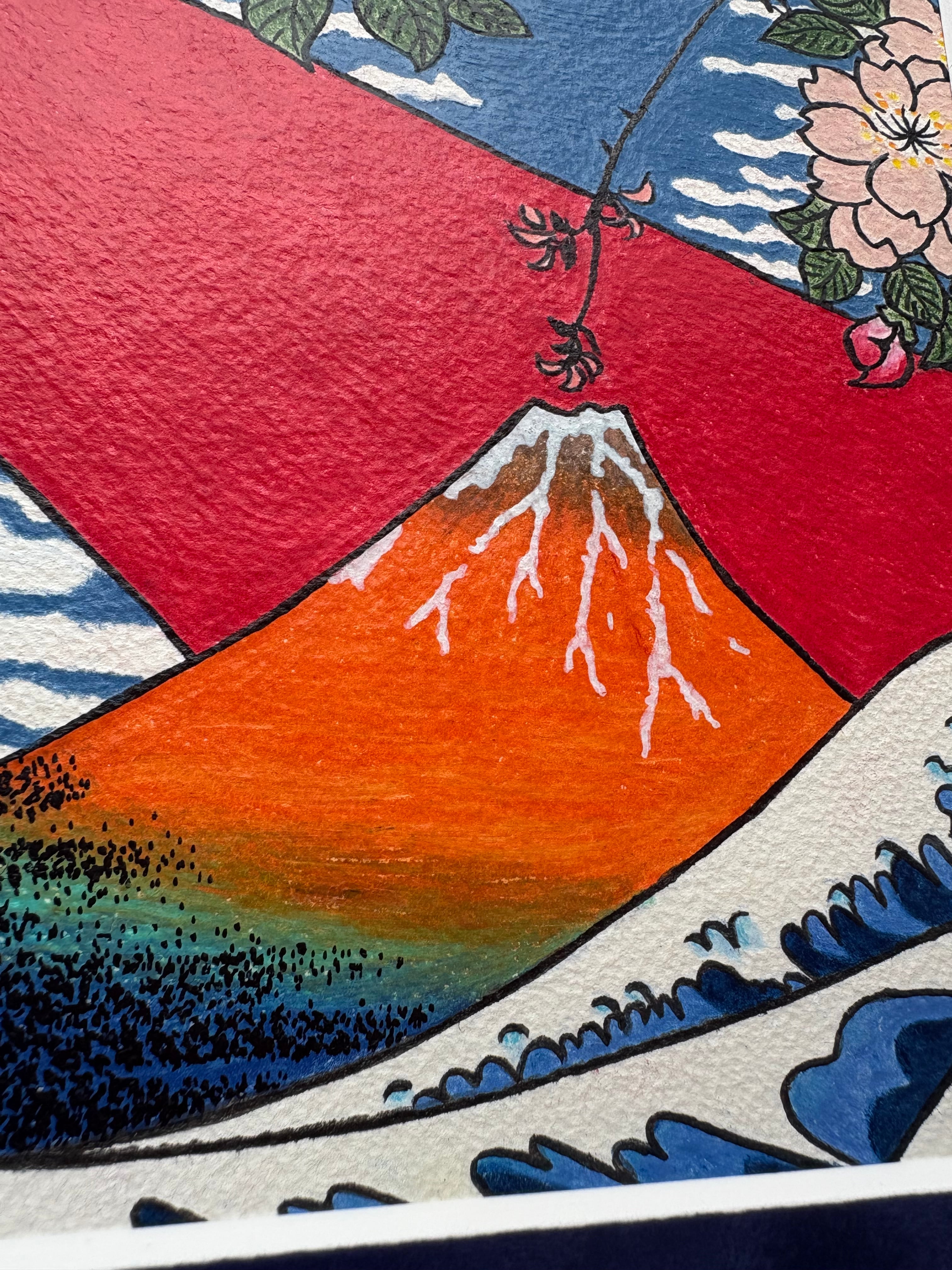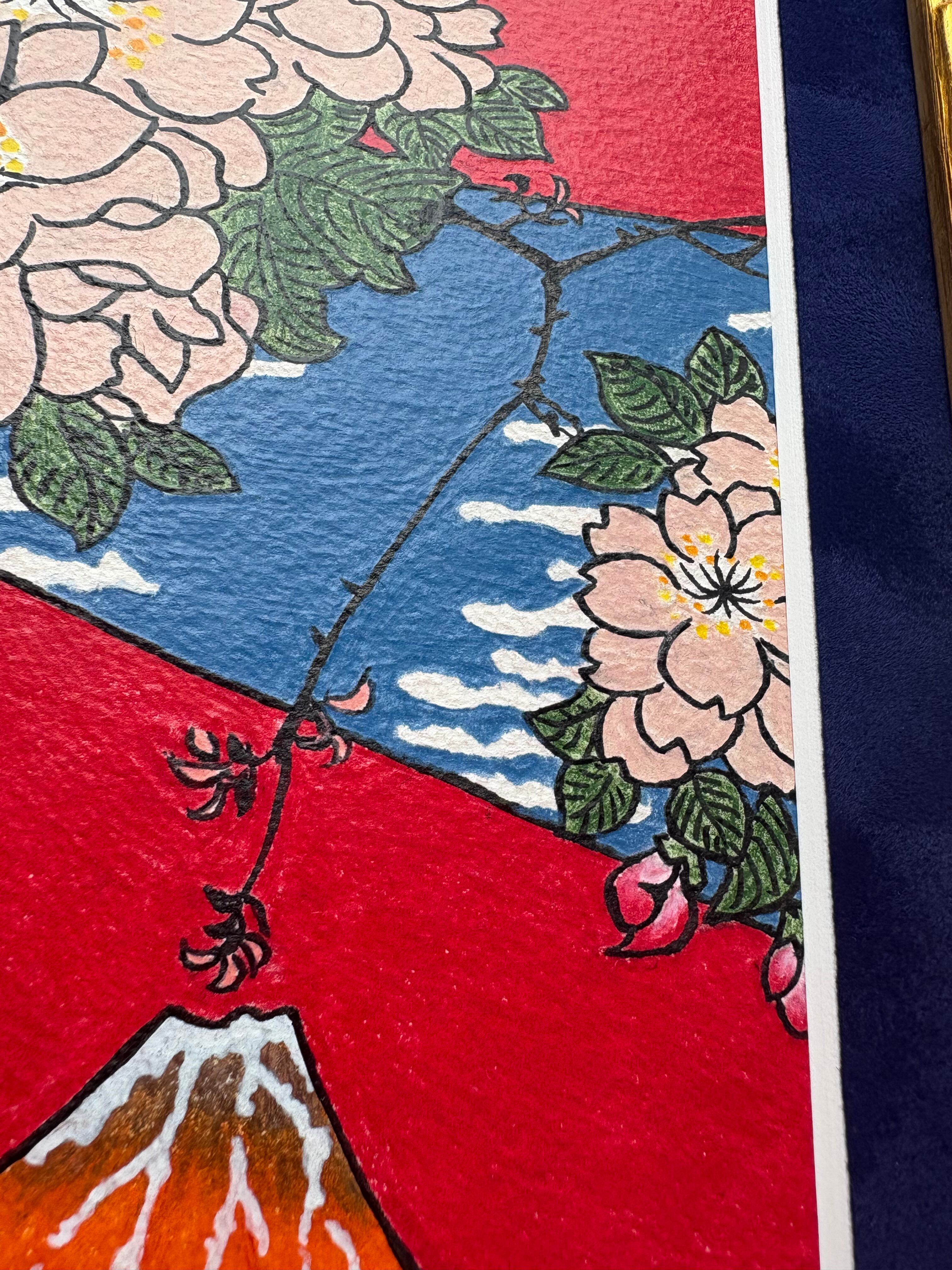 富士山の雄大さと、太陽の輝き、さらには桜の儚さが織りなす情景がを色鉛筆で再現しました。