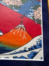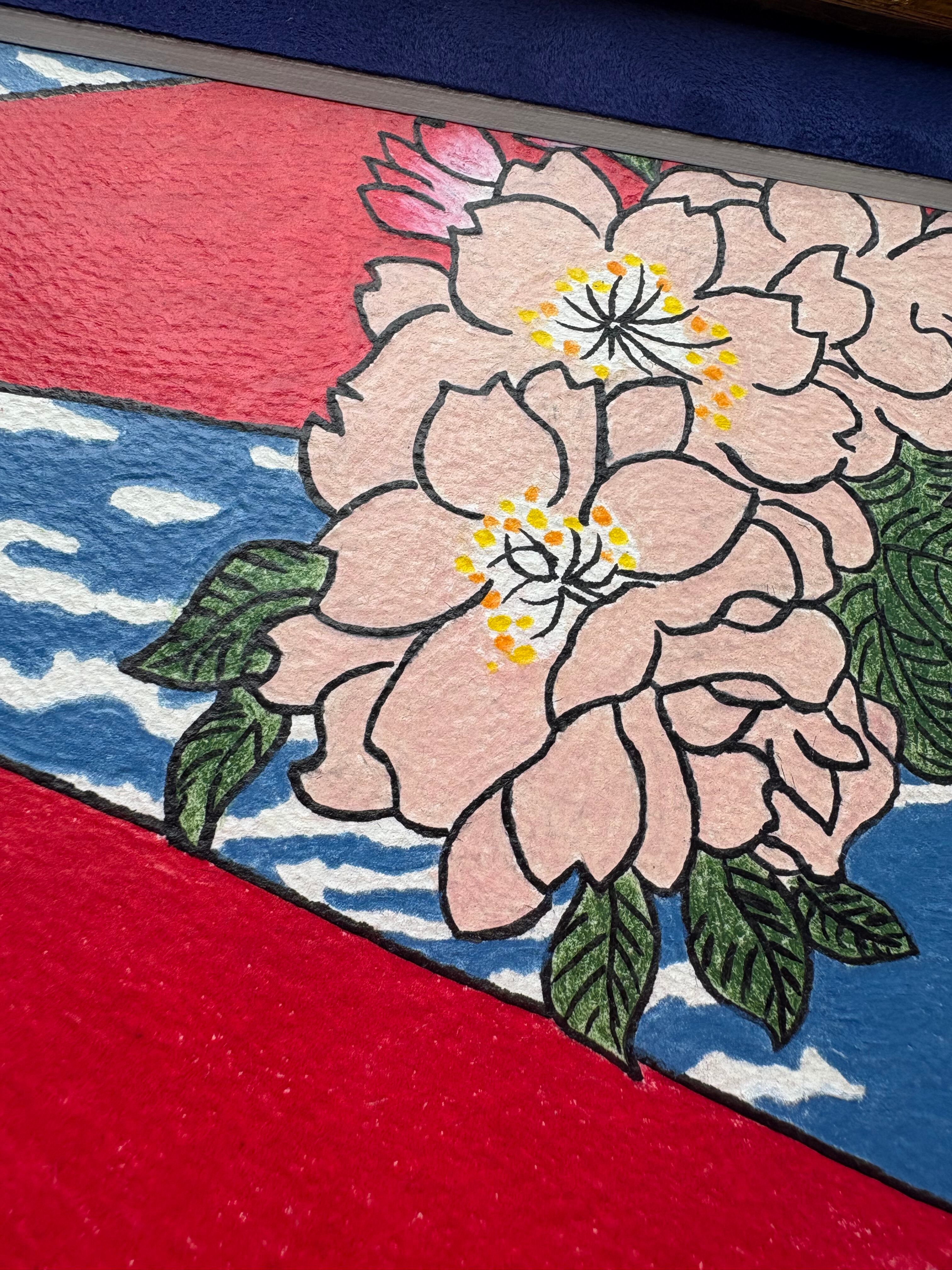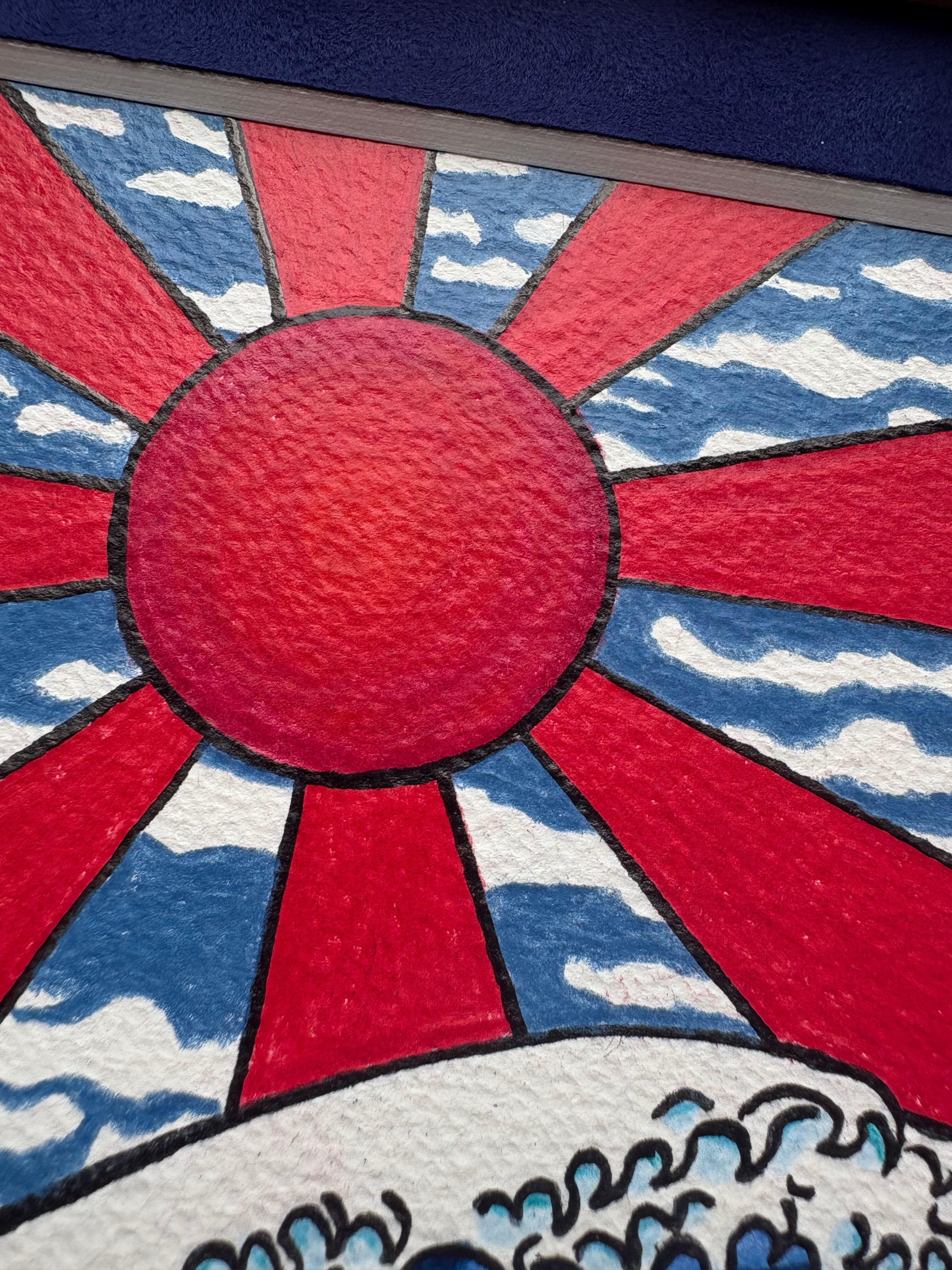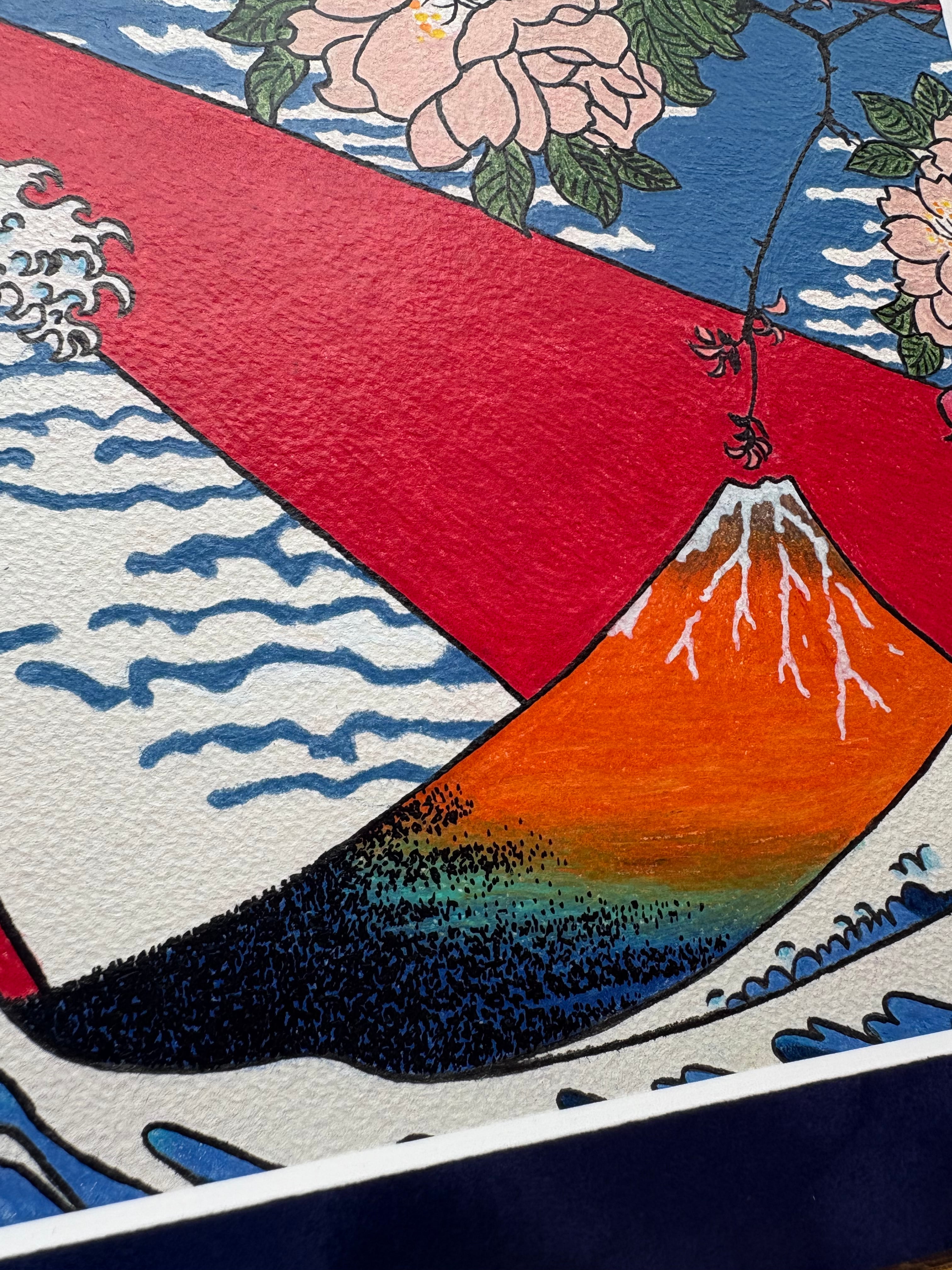 富士山の雄大さと、太陽の輝き、さらには桜の儚さが織りなす情景がを色鉛筆で再現しました。
