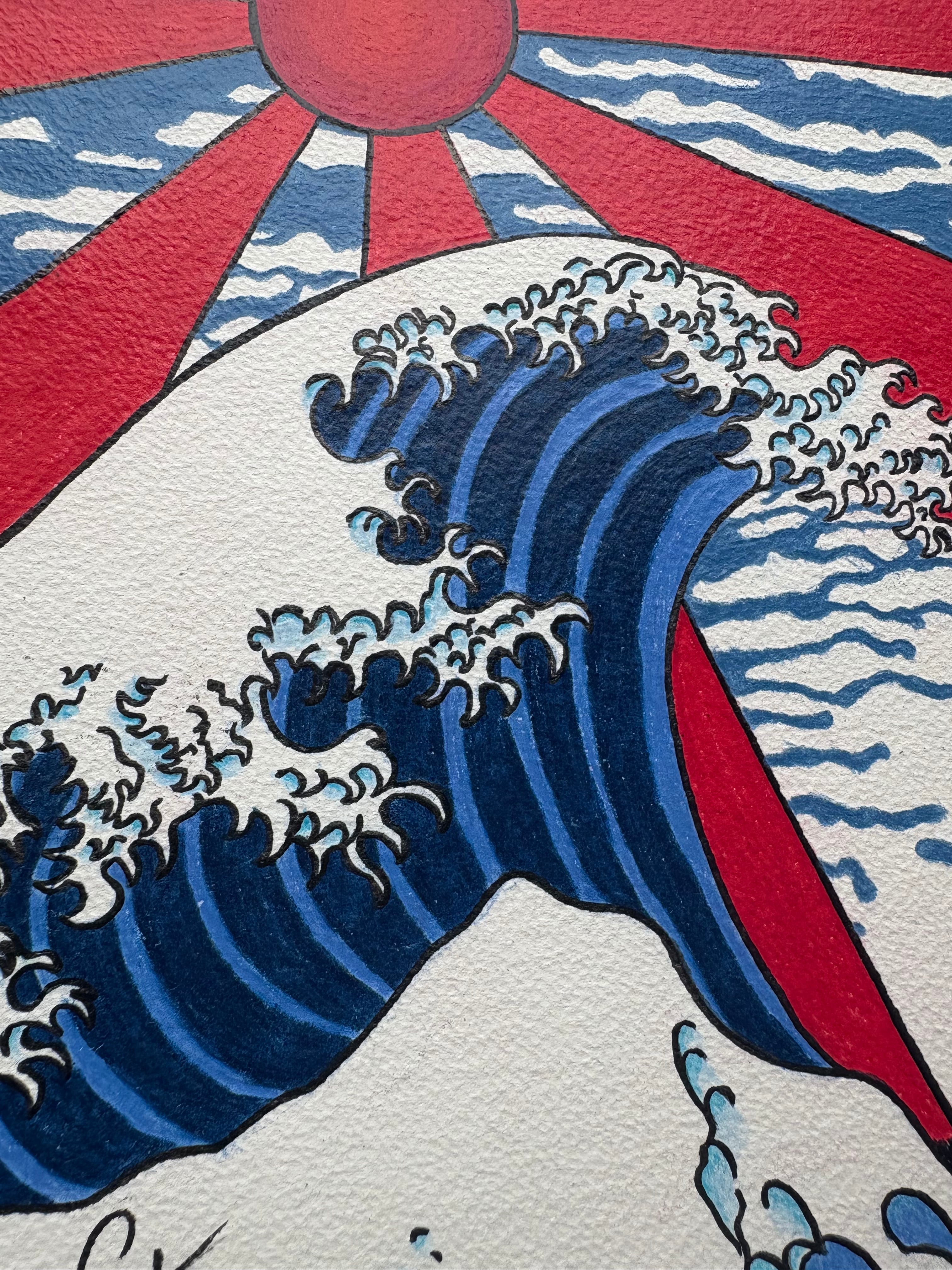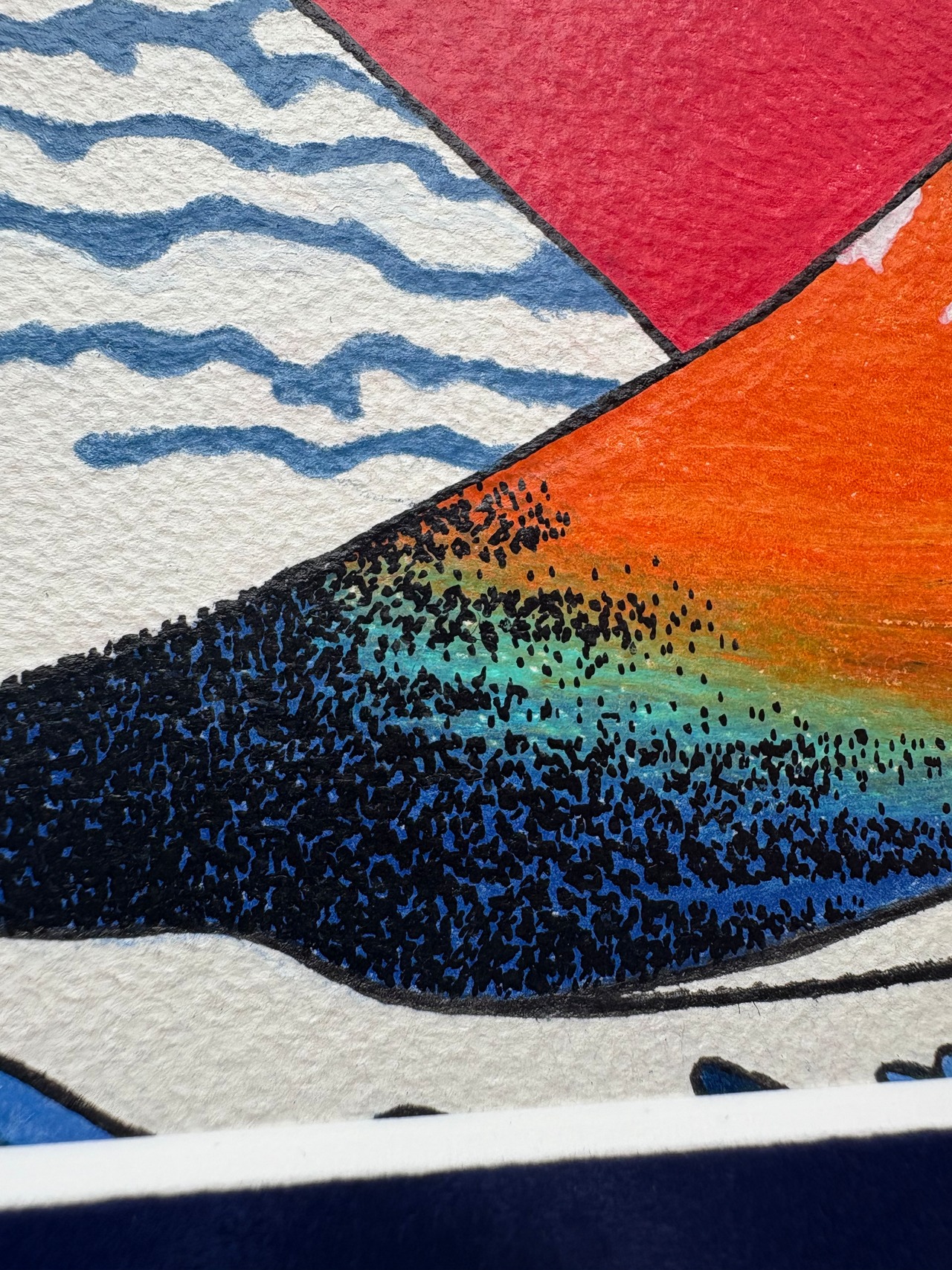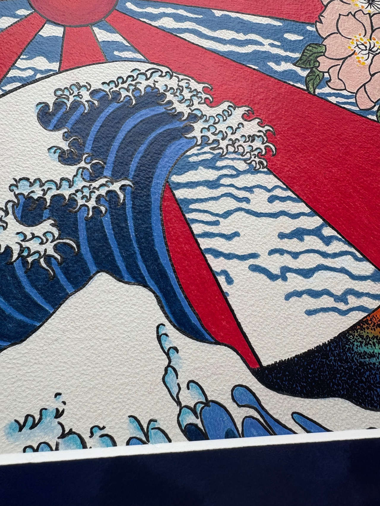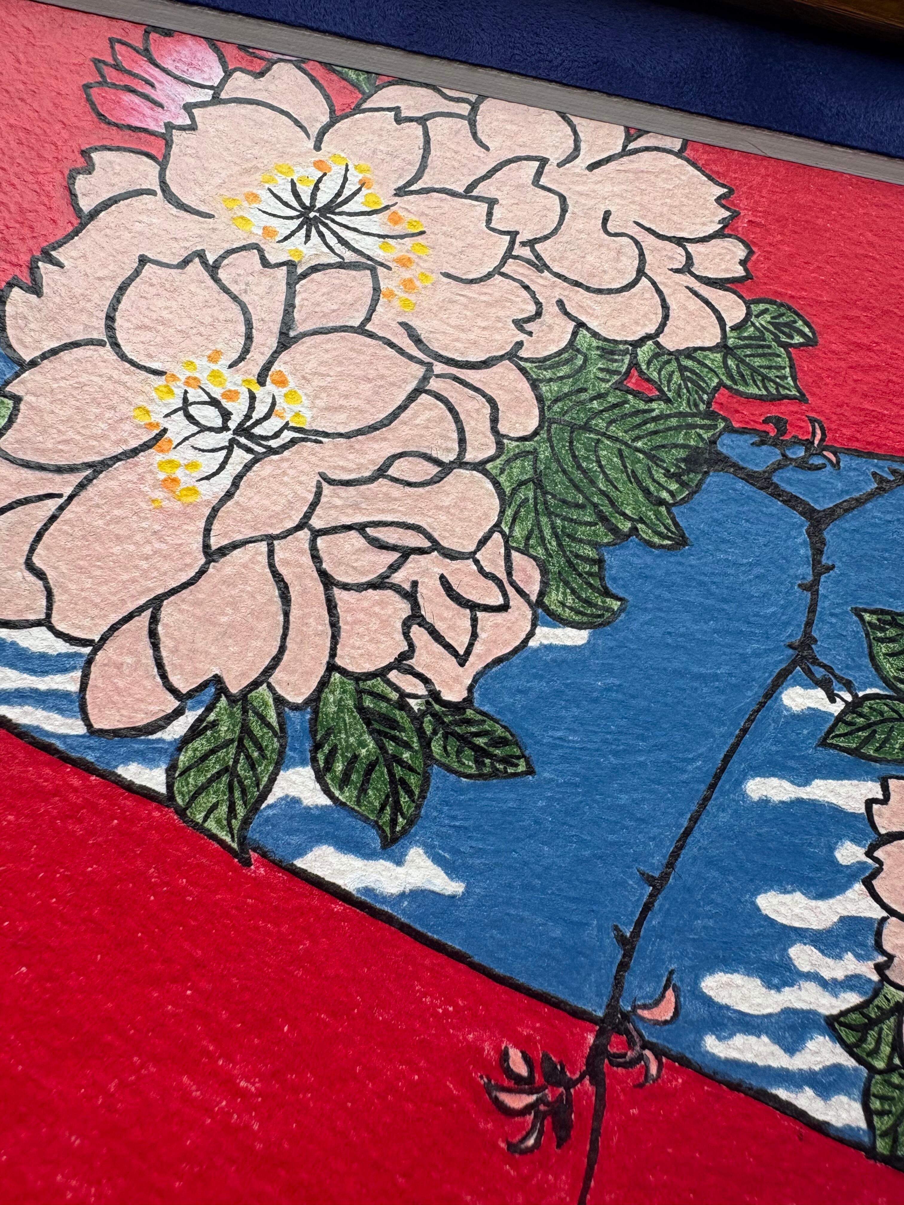 富士山の雄大さと、太陽の輝き、さらには桜の儚さが織りなす情景がを色鉛筆で再現しました。