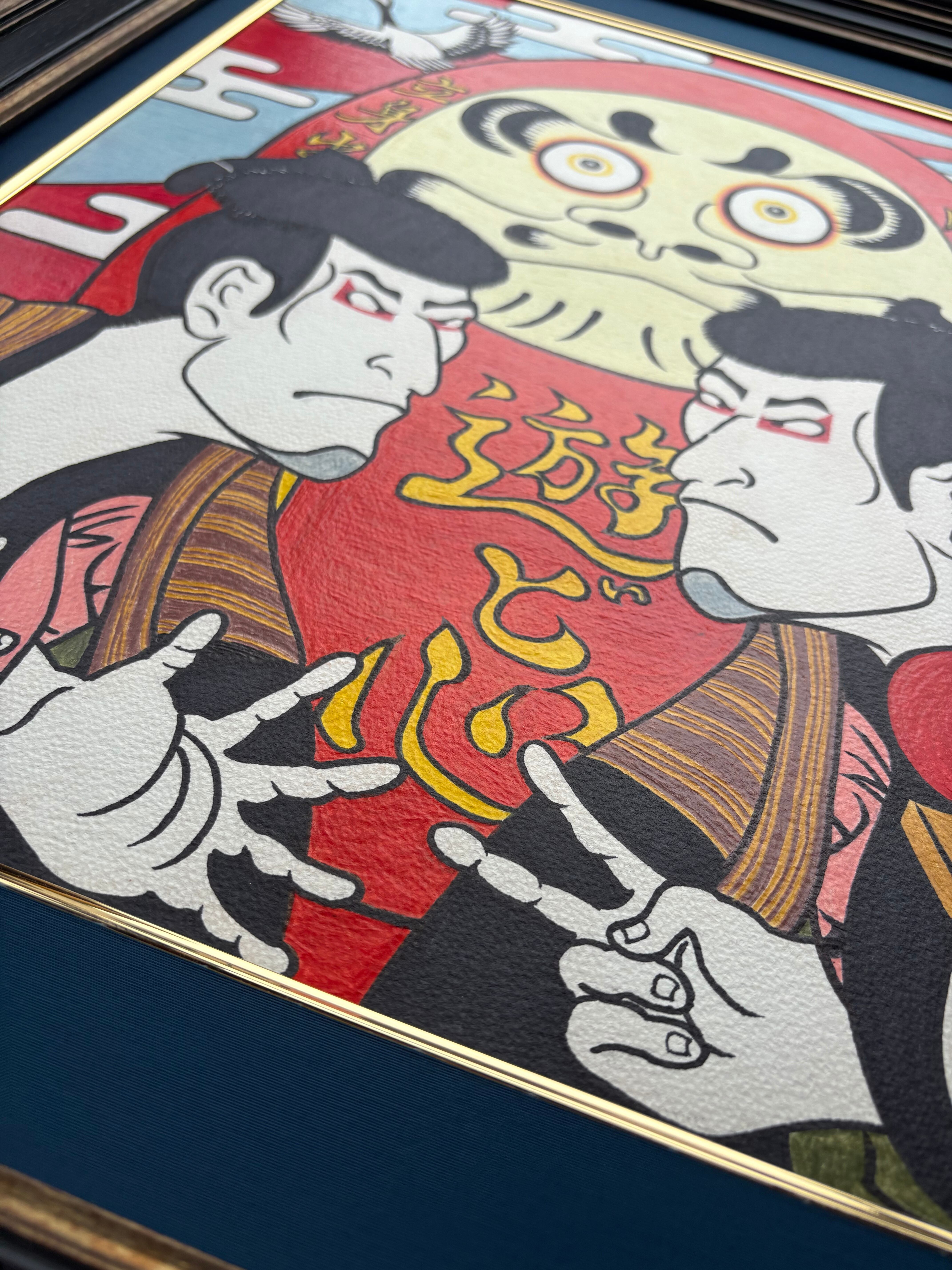 遊び心満載のこの作品は、達磨や鶴など、日本の伝統的なモチーフが楽しく組み合わさった特別なアートであり、見る人の心を明るく照らします。
