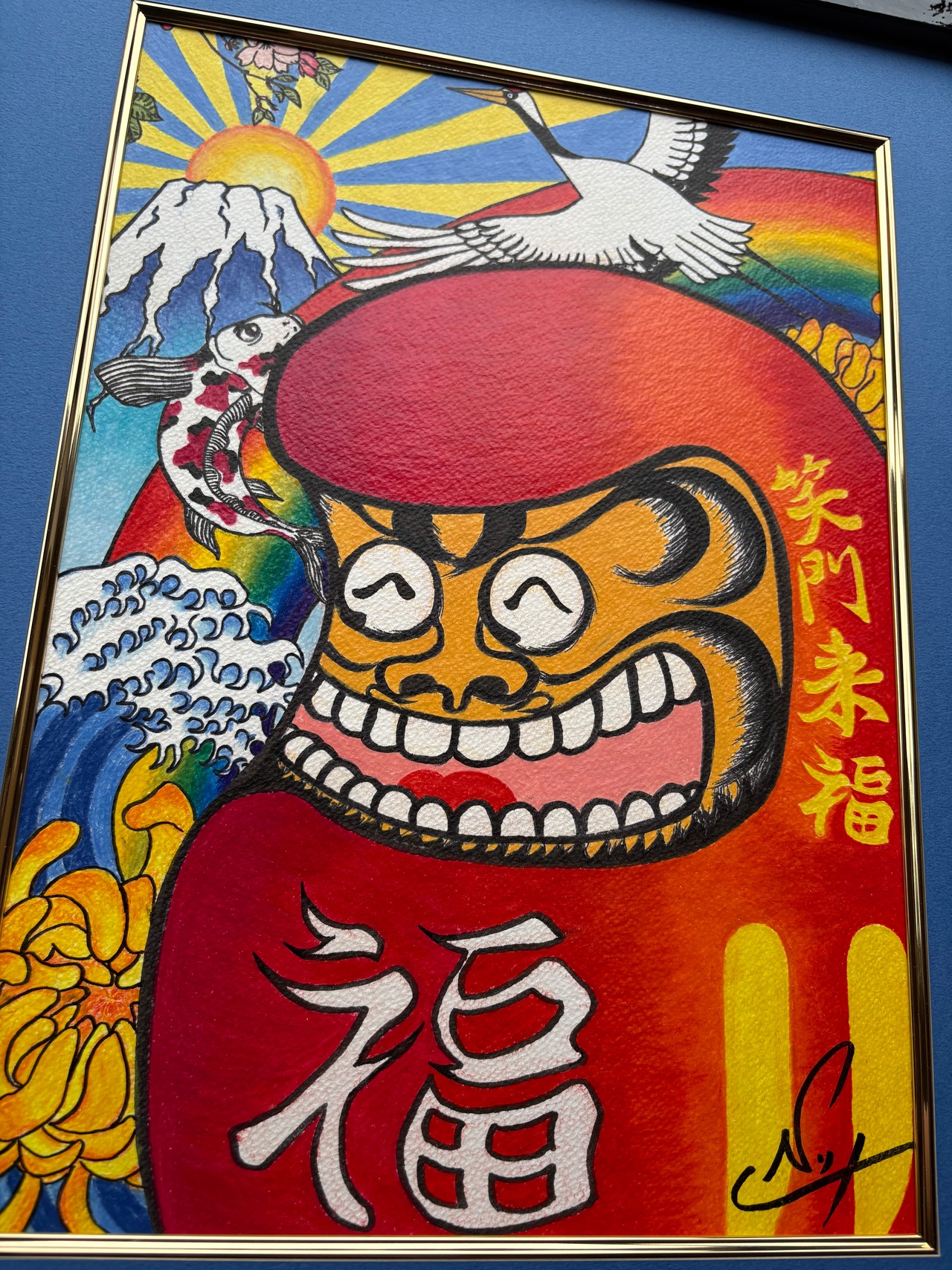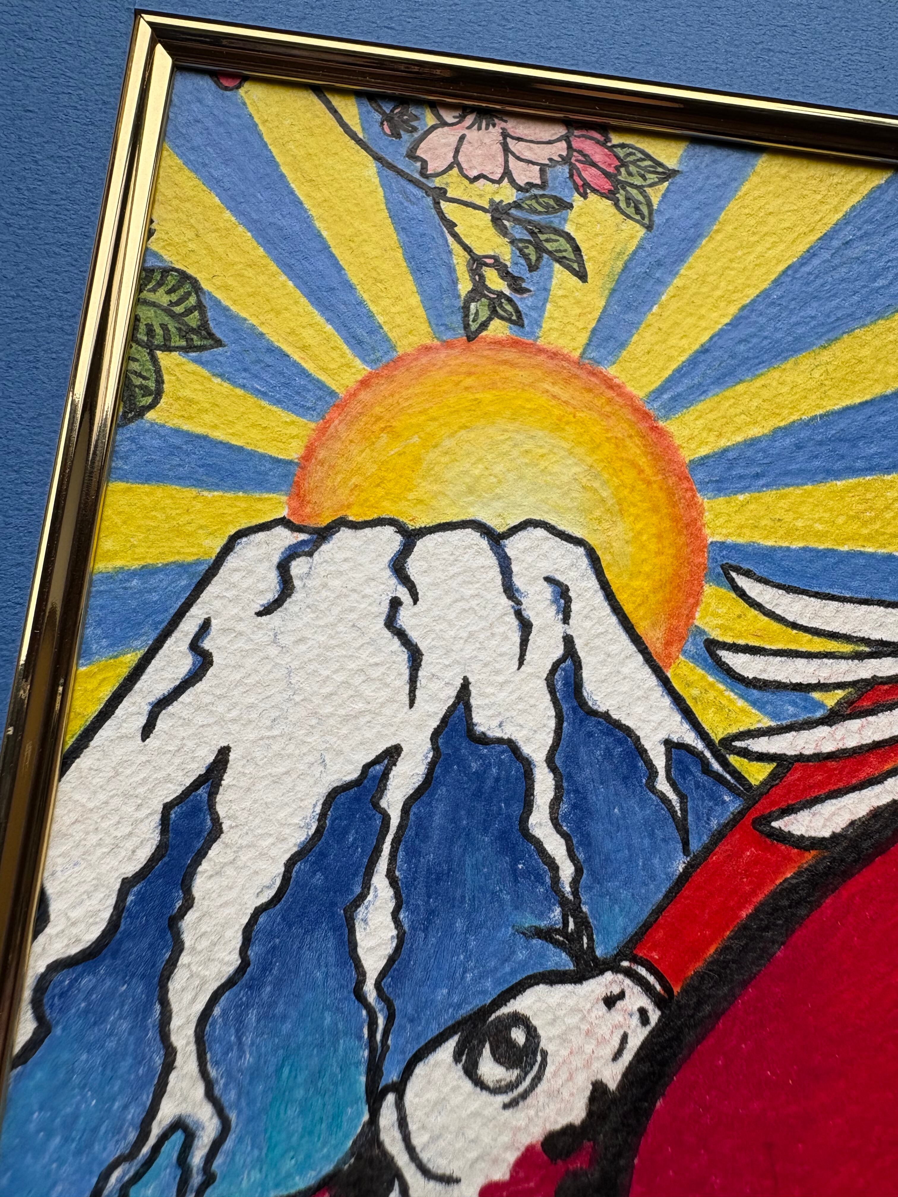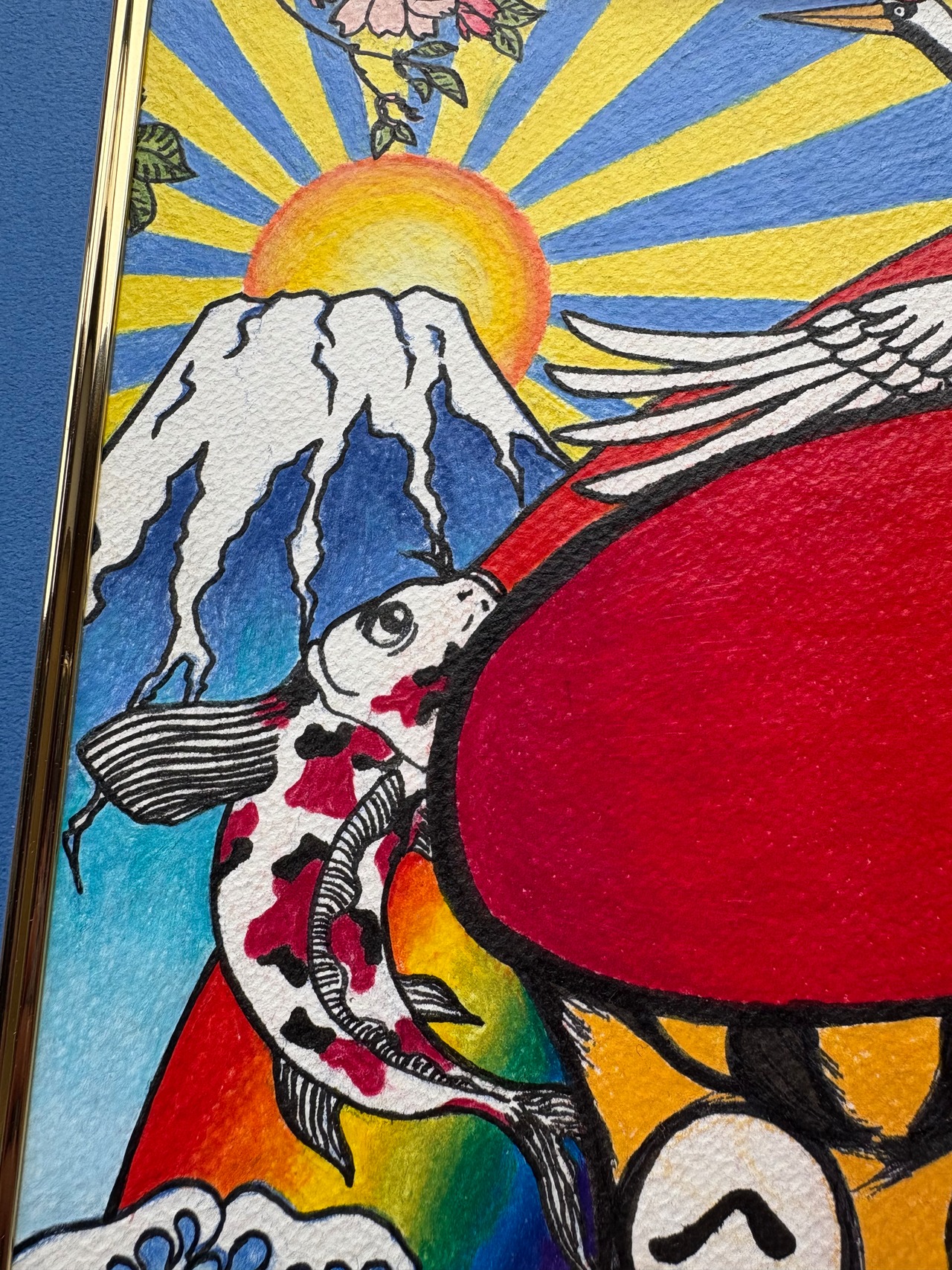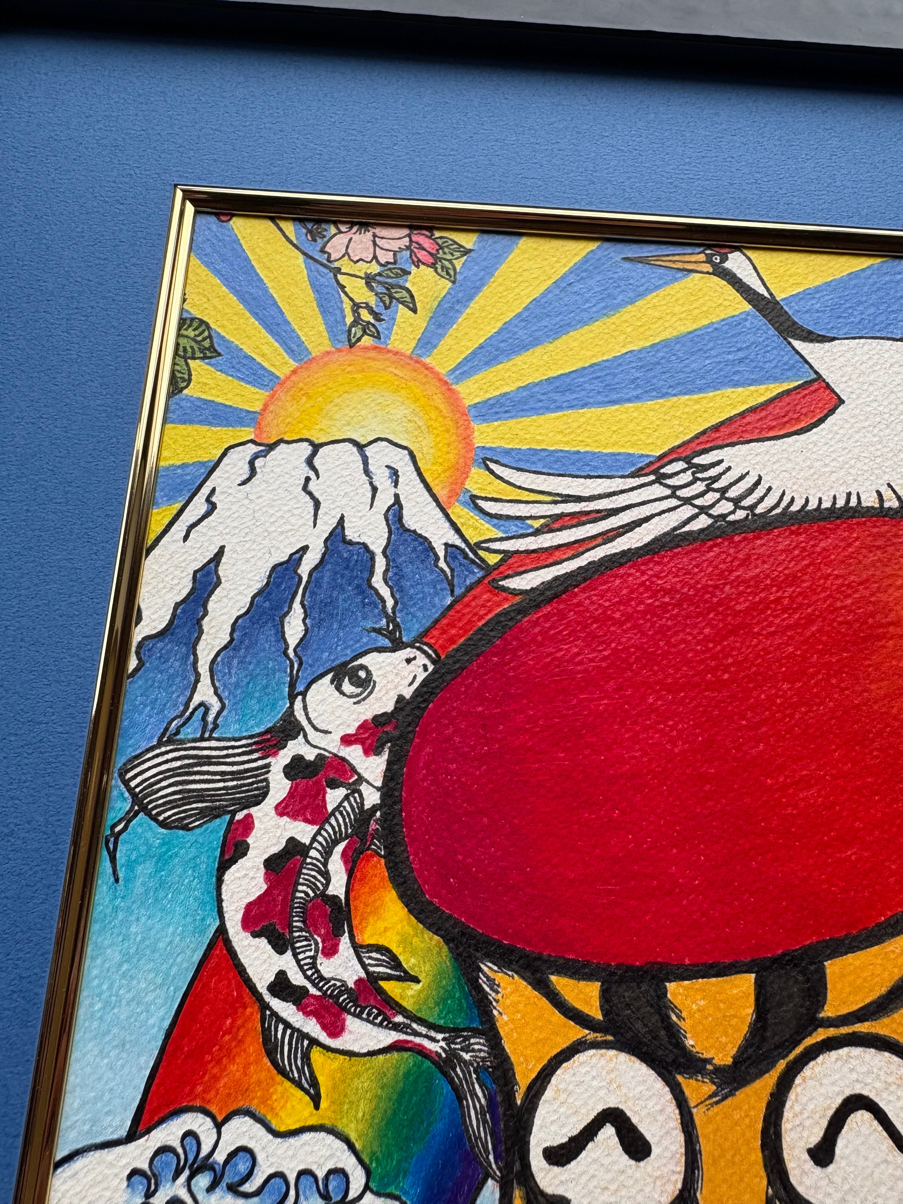 心温まる和のアート、「吉祥達磨」です!色鉛筆画による美しい和風イラストが、富士山、太陽、達磨、桜、鶴、菊、虹といった縁起物を描き出し、あなたの生活空間を華やかに彩ります。この原画は、遊び心を取り入れたデザインが特徴で、見る人に笑顔と幸福をもたらします。