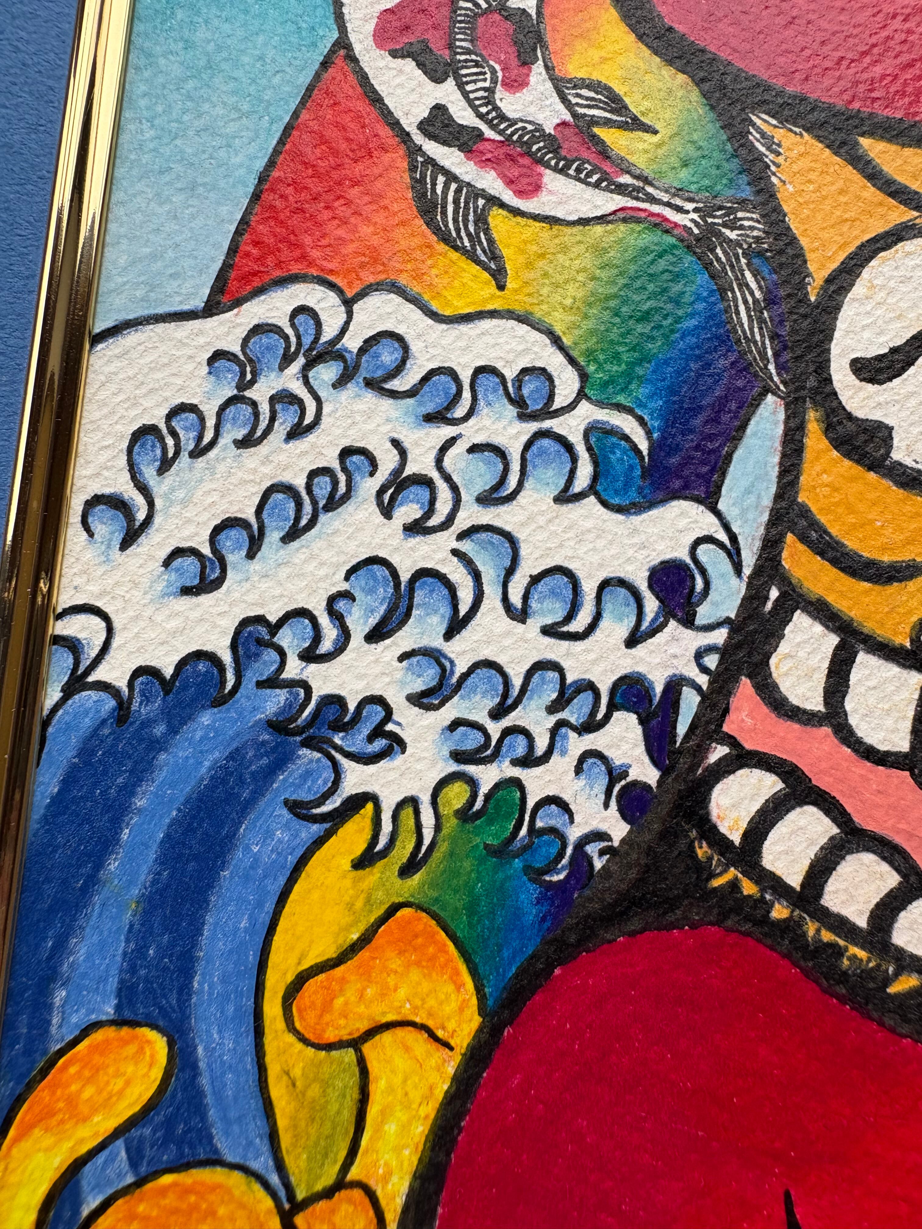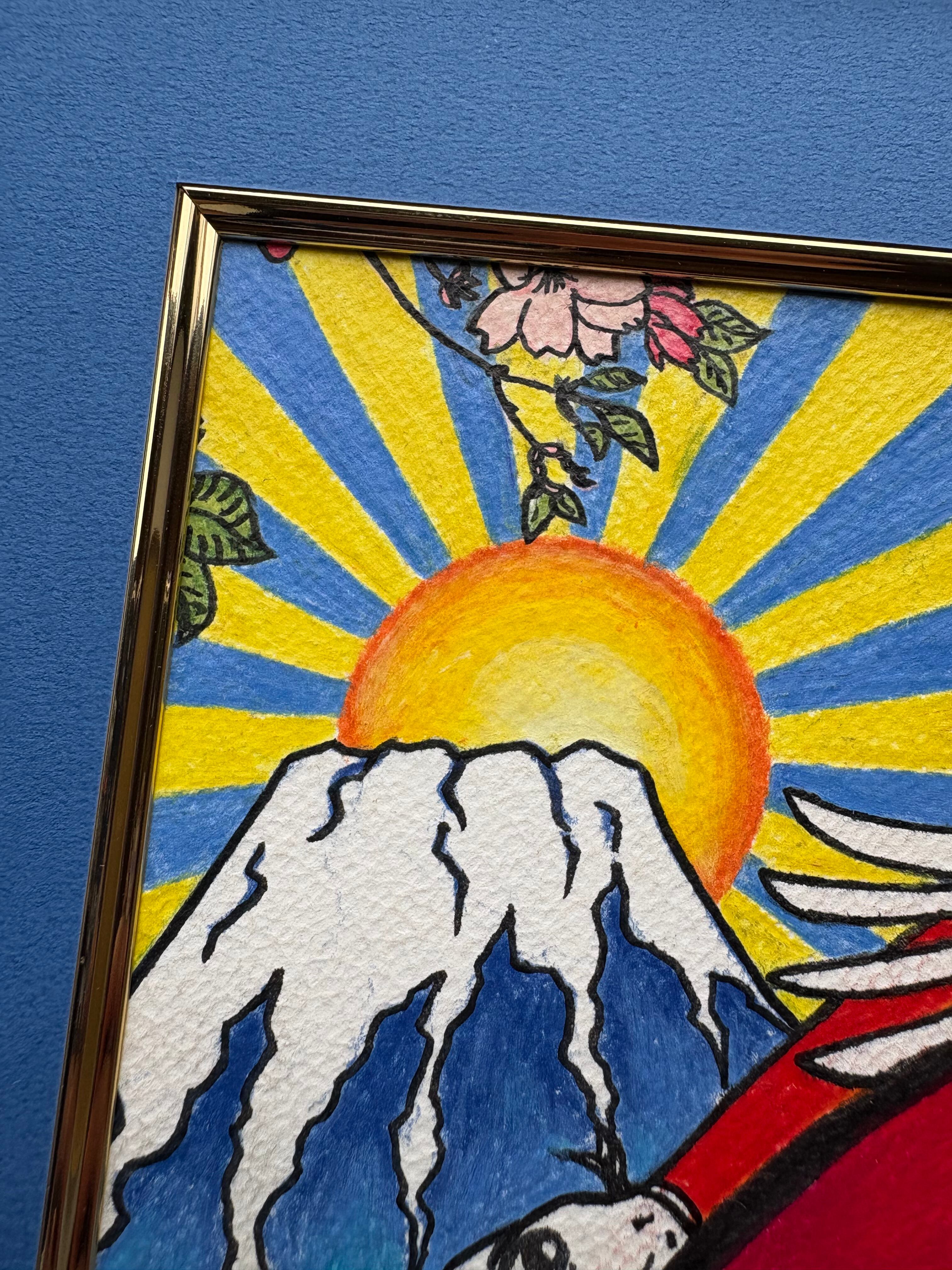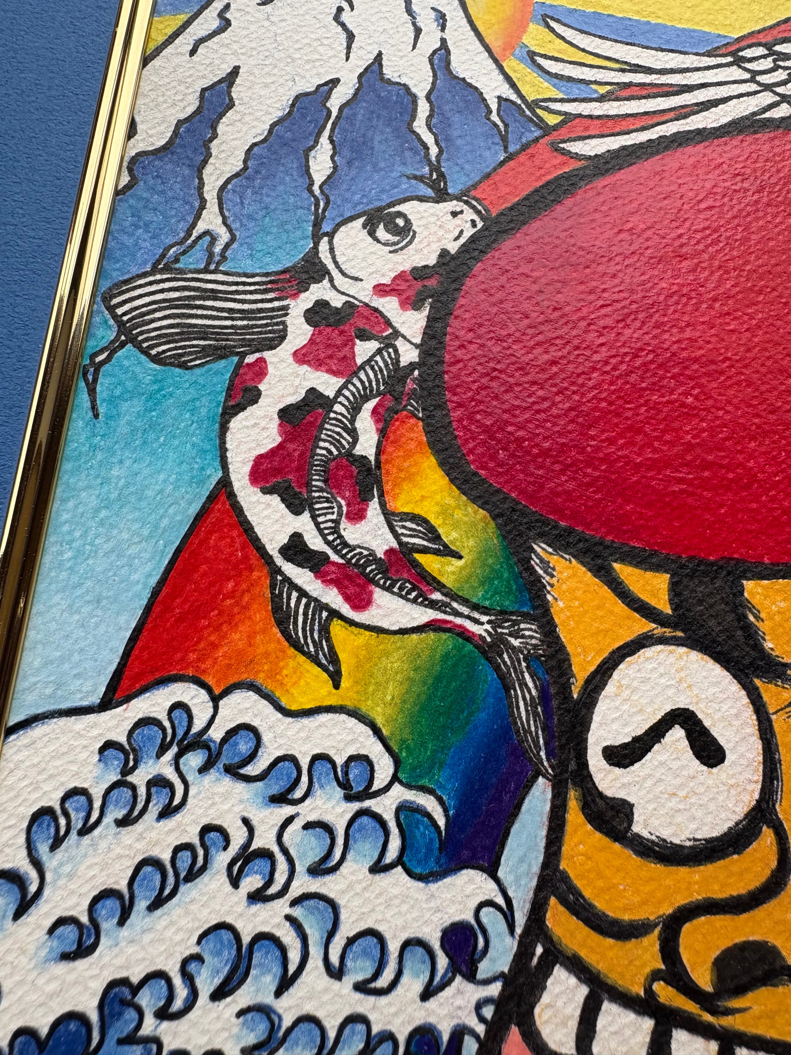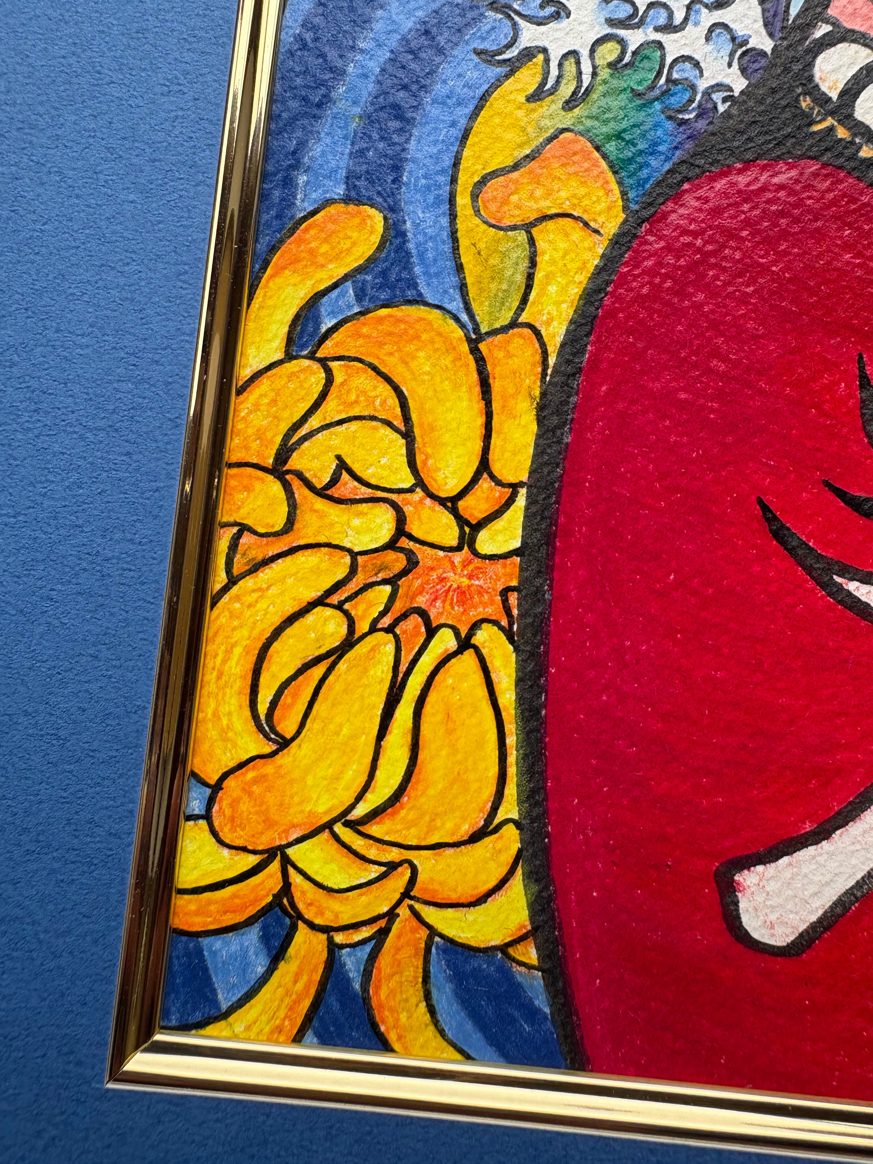 心温まる和のアート、「吉祥達磨」です!色鉛筆画による美しい和風イラストが、富士山、太陽、達磨、桜、鶴、菊、虹といった縁起物を描き出し、あなたの生活空間を華やかに彩ります。この原画は、遊び心を取り入れたデザインが特徴で、見る人に笑顔と幸福をもたらします。